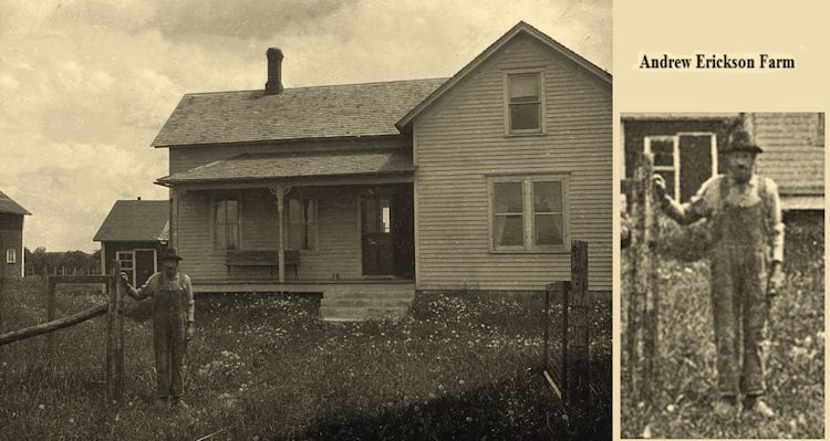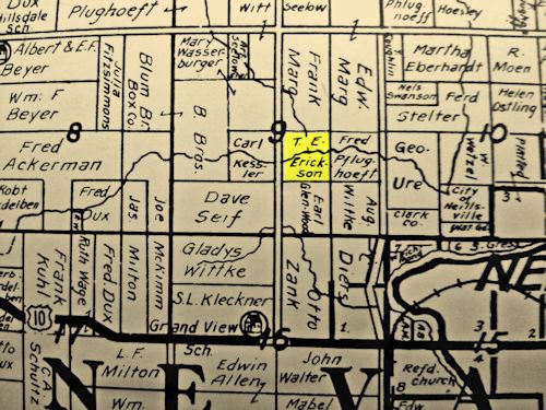*Apparently Thomas (Erick) Erickson, the son of Andrew & Bertha Erickson, ran this farm (map above) when the glass plate photo (pictured above) belonging to Steve Roberts were made. The same land was also owned by Pat Kelly at one time.
