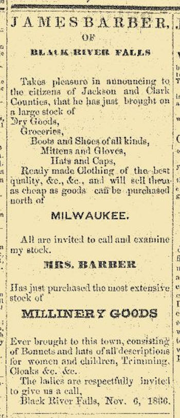 "James Barber of Black River Falls takes pleasure in announcing to the citizens of Jackson and Clark Counties, that he has just brought on a large stock of Dry Goods, Groceries, Boots and Shoes of all kinds, Mittens and Gloves, Hats and Caps, Ready made clothing of the best quality, and will sell them as cheap as goods can be purchased north of Milwaukee."