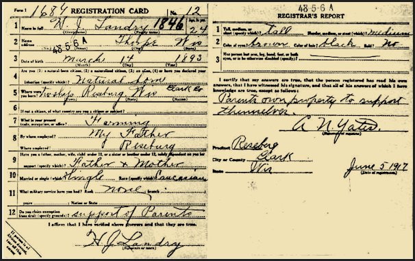 | Name: H. J Landry Sex Male Registration Date from 1917 to 1918 Place Clark, Wisconsin, United States Citizenship Place United States Birth Date 14 Mar 1893 Birthplace Reseburg, Wisconsin, United States Race Caucasian Affiliate Publication Number M1509 Affiliate Publication Title World War I Selective Service System Draft Registration Cards |