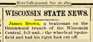 James Brown, a brakeman on the Greenwood branch of the Wisconsin Central, fell under the wheels at Spokefield (Spokesville) and had his right foot cut off.