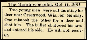 Two young men were out hunting for deer near Greenwood, Wis., on Sunday. One mistook the other for adeer and shot him. The bullet shattered his arm and entered his side. He will not recover.