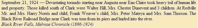 Postcard showing the Plantigo farm after it was destroyed in the September 21, 1924 tornado. The property was later sold to Eugene Clyde Enhelder (28 Jun 1878-13 Nov 1940) & his wife, Pearl Alice Frank (28 Jan 1892-12 Feb 1982) who had married in Littlefork, MN 17 Jun 1924. Eugene was born in Neillsville, WI and spent his younger years in Weston twp. He and Pearl later sold the property and moved to Township 71 Range 23, Koochiching, Minnesota.