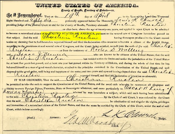 Christian Rusten Naturalization--19 Apr 1886, South Dakota, United States