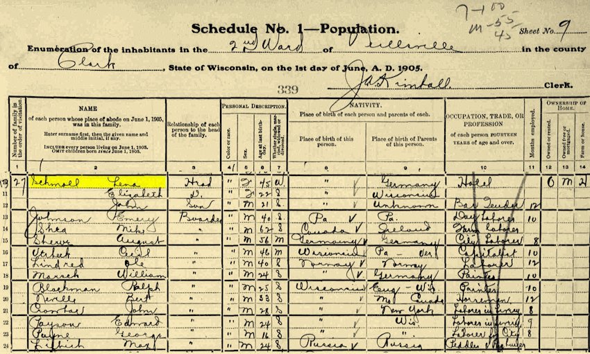 Lena Schmoll, 45 yr. (1859) old white widowed female--*Land Lady for the Wisconsin Hotel