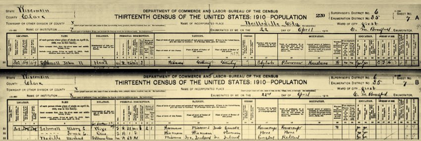 Mary E Schmoll Wife Female 28 Wisconsin, house keeper, father b. Missouri, mother Irish Canadian