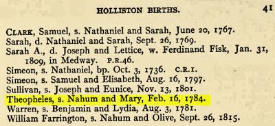 Nahum was born in Medway to Theophilus and Experience Clark on January 22, 1749-50. Mary Stearns married Nahum Clark of Holliston in Milford on July 9, 1772.