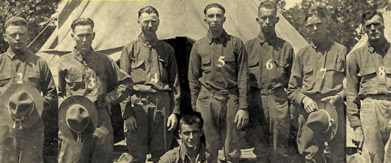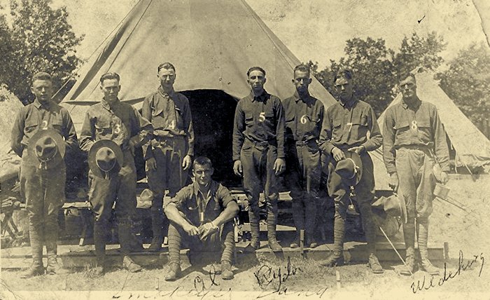 I need help identifying the soldiers in this photo titled "Smokey's Gang". It was taken in 1921 and belonged to Albert H. "Smokey" POKALLUS (1899-1971. Those pictured are probably all from the Colby, Marathon/Clark Co. WI area. If you can identify any of the individuals in the photo, please contact me. Thanks, Carol |