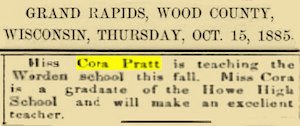 Cora Pratt was an 1884 graduate of Howe High School, Grand Rapids, Wisconsin. Upon completion of her schooling, she taught school in the town of Worden, Clark Co., Wisconsin. Her mother died during that school term of "Progressive Muscular Atrophy." Her father, Marcus Shumway Pratt died in 1927. All three of them are buried in the Forest Hill Cemetery, Grand Rapids, Wisconsin.