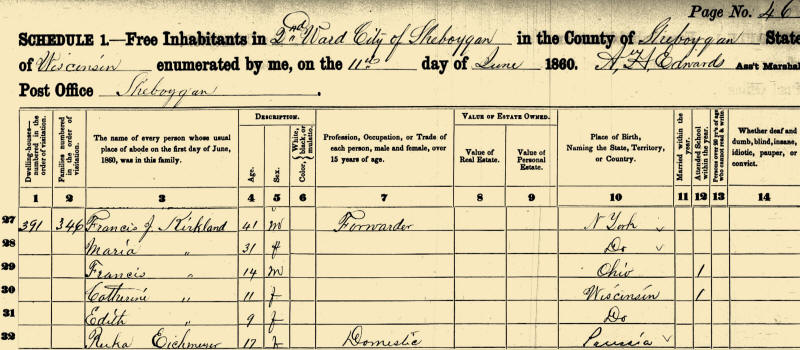 Catherine Kirkland Female 11 White 1849 Wisconsin (*married Samuel R. Spaulding,