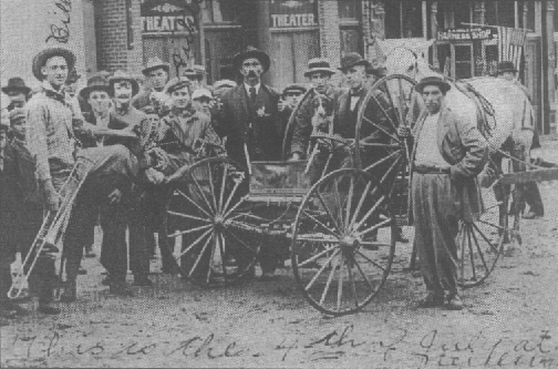 The photo above was taken 1912-1918 in Neillsville, Clark Co., WI at the 4th of July Celebration on the south side of West 5th Street between Hewett and West Streets. Standing in the middle of the group, wearing a dark suit, hat and mustache, is Sheriff Hanke. The photo postcard was mailed to the Frank Sholtz family. (Photo courtesy of Arlen Scholtz Belmer). This picture appeared in the "Good Old Days" column compiled by Dee Zimmerman for the July 16, 2003 Clark Co. Press of Neillsville, WI.