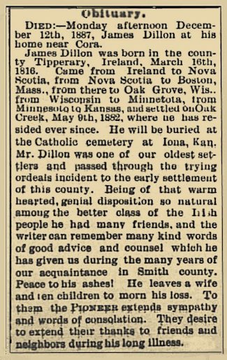 Mrs. Thomas Dillion, age 80 years, passed away at her home Friday evening at six o’clock. Up to two weeks before her death, Mrs. Dillion enjoyed the best of health. At that time she caught a cold, which caused pneumonia. Her daughter, Mrs. Dan McCarthy of Fond du Lac, was sent for soon after she became ill, and was with her until the end.