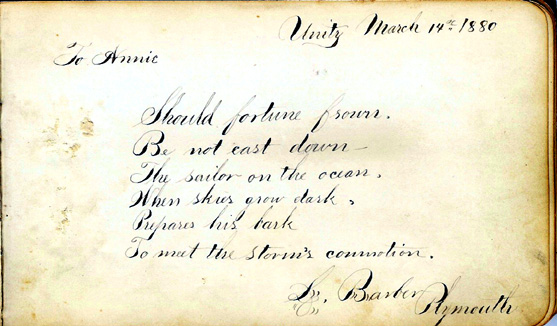 Pictured above is a page from an autograph album which once belonged to my great grandmother, Annie Petrie Olson. Annie's family - Adam Petrie, Elizabeth Moore Petrie and children George Walter, Edith and Annie lived in Unity from 1874 until 1888. The book must have been a Christmas gift in Dec., 1879. I counted 71 pages in the album with inscriptions from friends and relatives (1879 - 1889). Each inscription is hand written, usually with name, date and town. Some of the calligraphy is wonderful. In paging through, I see Unity, Thorpe, Brighton, Chippewa Falls, Concord, Stockbridge, Colby, Eau Claire, Neillsville, Oshkosh, Milwaukee, Withee. Most of the entries are from Unity. I eventually hope to provide scans of every page and this one, dated Mar. 14, 1880 was from a person named Barber who resided in Plymouth, WI.