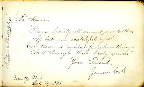 Pictured above is a page from an autograph album which once belonged to my great grandmother, Annie Petrie Olson. Annie's family - Adam Petrie, Elizabeth Moore Petrie and children George Walter, Edith and Annie lived in Unity from 1874 until 1888. The book must have been a Christmas gift in Dec., 1879. I counted 71 pages in the album with inscriptions from friends and relatives (1879 - 1889). Each inscription is hand written, usually with name, date and town. Some of the calligraphy is wonderful. In paging through, I see Unity, Thorpe, Brighton, Chippewa Falls, Concord, Stockbridge, Colby, Eau Claire, Neillsville, Oshkosh, Milwaukee, Withee. Most of the entries are from Unity. I eventually hope to provide scans of every page and this one, dated October 14, 1882 was from Jennie Cook of Unity, Wisconsin.