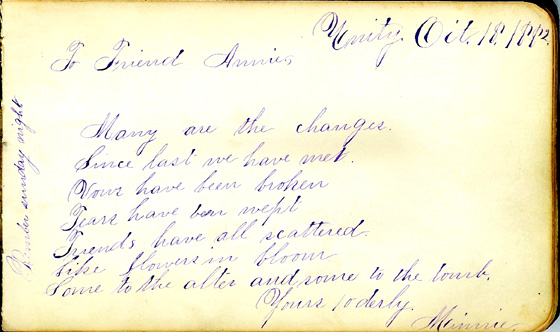 Pictured above is a page from an autograph album which once belonged to my great grandmother, Annie Petrie Olson. Annie's family - Adam Petrie, Elizabeth Moore Petrie and children George Walter, Edith and Annie lived in Unity from 1874 until 1888. The book must have been a Christmas gift in Dec., 1879. I counted 71 pages in the album with inscriptions from friends and relatives (1879 - 1889). Each inscription is hand written, usually with name, date and town. Some of the calligraphy is wonderful. In paging through, I see Unity, Thorpe, Brighton, Chippewa Falls, Concord, Stockbridge, Colby, Eau Claire, Neillsville, Oshkosh, Milwaukee, Withee. Most of the entries are from Unity. I eventually hope to provide scans of every page and this one, dated October 18, 1882 was from Minnie of Unity, Wisconsin.