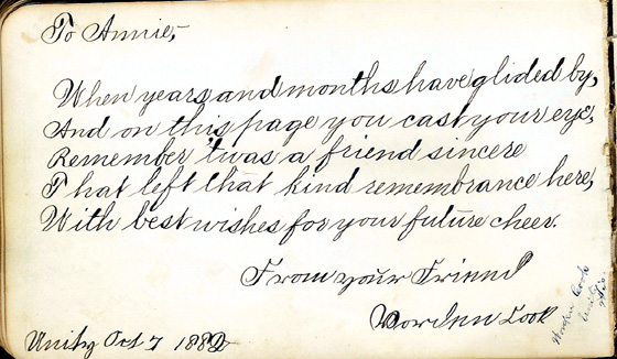 Pictured above is a page from an autograph album which once belonged to my great grandmother, Annie Petrie Olson. Annie's family - Adam Petrie, Elizabeth Moore Petrie and children George Walter, Edith and Annie lived in Unity from 1874 until 1888. The book must have been a Christmas gift in Dec., 1879. I counted 71 pages in the album with inscriptions from friends and relatives (1879 - 1889). Each inscription is hand written, usually with name, date and town. Some of the calligraphy is wonderful. In paging through, I see Unity, Thorpe, Brighton, Chippewa Falls, Concord, Stockbridge, Colby, Eau Claire, Neillsville, Oshkosh, Milwaukee, Withee. Most of the entries are from Unity. I eventually hope to provide scans of every page and this one, dated October 7, 1882, was from Worden Cook?, of Unity, WI.
