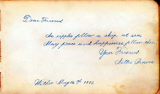 Pictured above is a page from an autograph album which once belonged to my great grandmother, Annie Petrie Olson. Annie's family - Adam Petrie, Elizabeth Moore Petrie and children George Walter, Edith and Annie lived in Unity from 1874 until 1888. The book must have been a Christmas gift in Dec., 1879. I counted 71 pages in the album with inscriptions from friends and relatives (1879 - 1889). Each inscription is hand written, usually with name, date and town. Some of the calligraphy is wonderful. In paging through, I see Unity, Thorpe, Brighton, Chippewa Falls, Concord, Stockbridge, Colby, Eau Claire, Neillsville, Oshkosh, Milwaukee, Withee. Most of the entries are from Unity. I eventually hope to provide scans of every page and this one, dated May 14, 1882, was from Nettie Brown, of Withee, WI.
