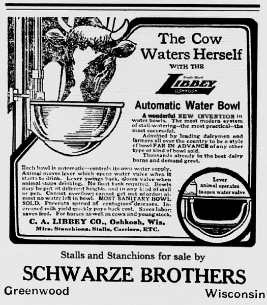 The Schwarze Brothers' Machinery and Implement dealership once stood where the Farmer's and Merchant's bank now stands on Central Ave., in Greenwood, Wisconsin. It was owned by Albert and Adolph Schwarze, the son's of Herman who had a blacksmith shop in the township of Warner. Albert initially followed in his father's footsteps by beginning a career as a blacksmith and had a thriving business with Fred Rossman. As the world became automated, he and his younger brother, Adolph, met the needs of the time and opened the business represented in the Ad below. After 35 years of business, this establishment was sold and renamed, "The Haunschild Implement." Ultimately, the building was torn down and a new Farmer's & Merchant's Bank took its place.