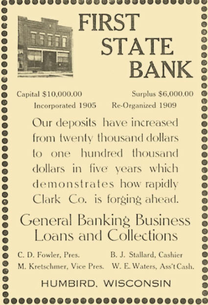 The officers for The First Bank of Humbird, Wisconsin in 1915 were: C. D. Fowler, Pres.; M. Kretschmer, Vice Pres.; B. J. Stallard Chashier; and W. E. Waters, Assistant Cashier. The business was established in 1905 and re-organized in 1901.