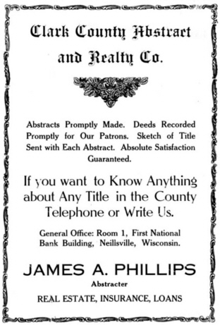 This Advertisement, for James A. Phillip's Real Estate, Insurance & Loans appeared on the inside of the back page of the publication. It was submitted by Janet Rogolski, curator for The Thorp Area History Museum from her private collection.