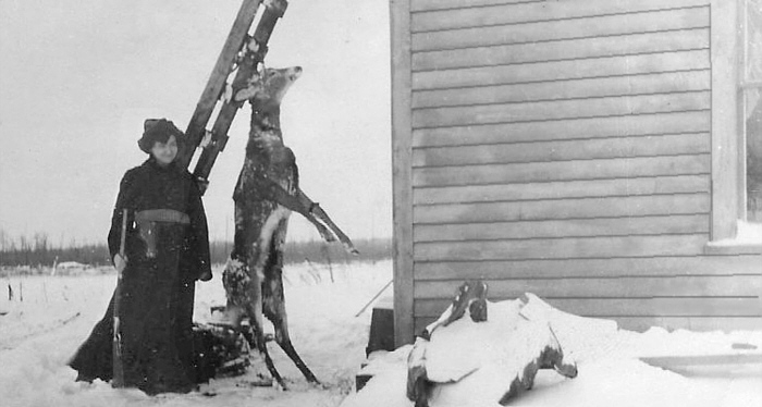 Pictured above is Mrs. George Lindy of Withee, Clark Co., WI, with a doe she shot.