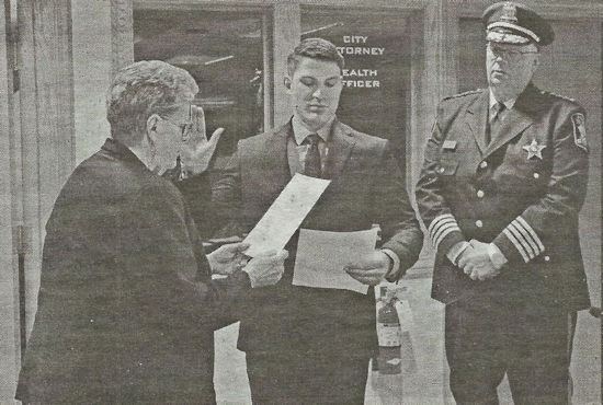Neillsville Chief of Police Jim Mankowski watches as Mayor Diane Murphy swears