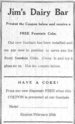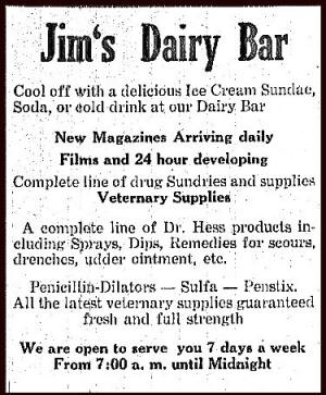 Jim's Dairy Bar was owned by William F. Neuenfeldt was first operated by his son, James Neuenfeldt followed by Raymond "Bud" Ackerman, Mr. & Mrs. Russell Edwards, and Gerald Neuenfeldt (another of Wm. Neuenfeldt's sons).