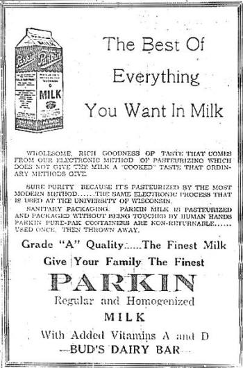 *The "Ice Cream Review, described Parkin's as a "dream plant" for the average size ice cream maker. John Parkin took it over from his father and expanded the product line to include a number of specialty dairy products such as cottage cheese and molded popsicles. Two well-known local products were the chocolate and butterscotch covered "Susy Bars," and the molded popsicles called "Todd Twins," both named for the Parkin children. More Information |