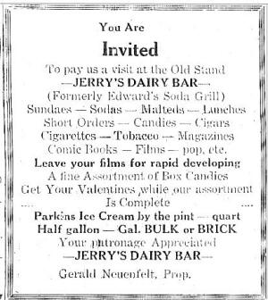 Jim's Dairy Bar was owned by William F. Neuenfeldt was first operated by his son, James Neuenfeldt followed by Raymond "Bud" Ackerman, Mr. & Mrs. Russell Edwards, and Gerald Neuenfeldt (another of Wm. Neuenfeldt's sons).