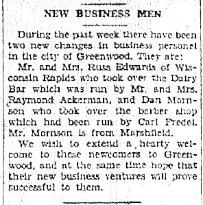 personnel in the city of Greenwood, Wis. They are: Mr. and Mrs. Russ Edwards of Wisconsin Rapids who took over the Dairy Bar which was run by Mr. and Mrs. Raymond Ackerman and Dan Morrison who took over the barber shop which had been run by Carl Fredel. Mr. Morrison is from Marshfield. |
