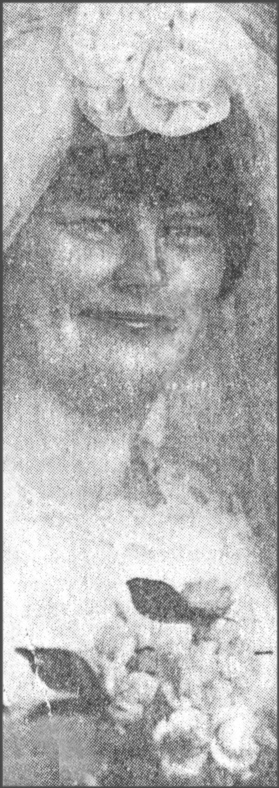She has a floor-length gown of Chantilly lace fashioned with detachable chapel-sweep train. Her half-hat of organza rose petals holds her bouffant elbow length veil of illusion and her flowers are yellow roses.