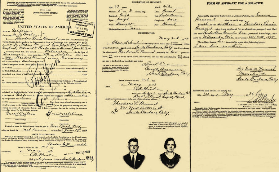 Emma Priebe was born in the spring of 1867 in Golumbia Moglino Poseu, Germany*. She married Theodore Hummel, a native son of Obhausen, Sachsen, Germany, in Wenona, Marshall Co., Illinois, 23 Jul 1891. A new coal mine had just opened in Wenona and many immigrants found work in the bustling town. Both Emma and her husband Theodore Sr. were bakers. They became the parents of a dozen children: Bertha, Clara, Ernest (died as a 2 mo. old infant), Ted, Bill, Emma (their Christmas baby, died at the age of three), Dorothy, Art, Margaret, Henry and Fred. Following the birth of their eleventh child and youngest son Fred in 1905, the family was split by divorce and a prison term at the Wisconsin State Correctional Institute in Waupun, Wisconsin for Theodore. Emma and her children began a new life in Santa Barbara, CA where she opened her own bakery and later enlarged it into a full grocery store. On the 1920 Census, she was listed as "widowed" . Ted's 1923 passport listed his father's residence as "unknown" which seems to indicate the family had little or no contact with Theodore Sr. after his prison term. Most certainly that would have been a far greater punishment than the time he spent behind bars.
