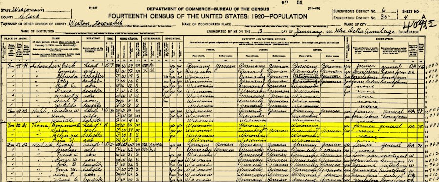 1920 Federal Census, Weston, Clark, WI - Rented Farm, recorded by Della