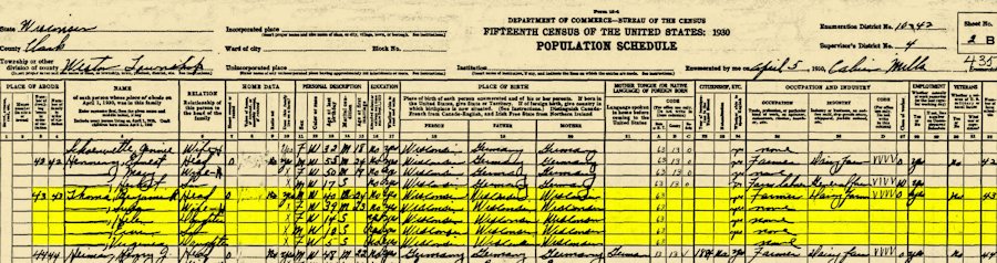 1930 Federal Census, Weston, Clark, WI, Dwelling Number: 43, Family Number: 43
