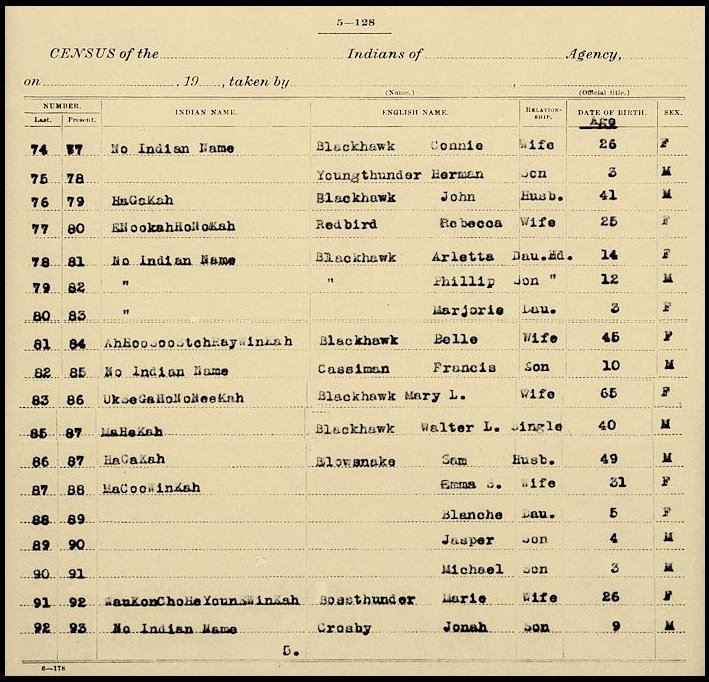 Surnames: Blackhawk, Buffalo, Carriman, Cassiman, Clay, Climar, Crow, Hindelay, Red Bird, Walker, Whiterabbit, Yellowthunder, Young Thunder