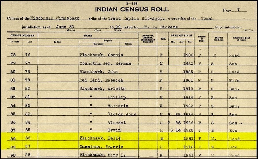 Belle Cassiman / Blackhawk married Charles Greencrow. He was born in Nebraska and she was a former student of Greenwood, Wisconsin High School and the former wife of Arthur Cassiman..