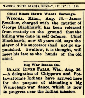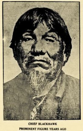 ![]() Chief Blackhawk--Prominent figure years ago. One of the best known and respected characters of the logging days before turn of century in Black River Falls area was Chief Blackhawk, who died about 20 years ago at the age of 80. The Winnebago chief spent the declining years of his life at the Black River Falls Indian Mission. |