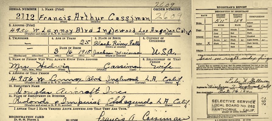Francis Cassiman appears on the 1940 Census working as a 40 yr. old sheet metal worker for an aircraft manufacturer (Douglas Aircraft).