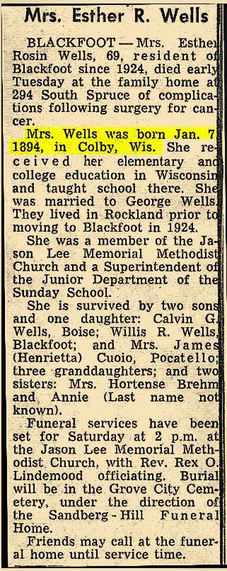 Mrs. Esther R. Wells BLACKFOOT--Mrs.. Esther Rosin Wells, 69, resident of Blackfoot since 1924, died early Tuesday at the family home of 294 South Spruce of complications following surgery for cancer. Mrs. Wells was born Jan. 7, 1894, in Colby, Wis. She received her elementary and college education in Wisconsin and taught school there. She was married to George Wells. They lived in Rockland prior to moving to Blackfoot in 1924. She was a member of the Jason Lee Memorial Methodist Church and a Superintendent of the Junior Department of the Sunday School. She is survived by two sons and one daughter: Calvin G. Wells, Boise; Willis R. Wells, Blackfoot; and Mrs. James (Henrietta) Cuoio, Pocatello; three granddaughters; and two sisters: Mrs. Hortense Brehm and Annie. Funeral services have been set for Saturday at 2 p.m. at the Jason Lee Memorial Methodist Church, with Rev. Rex O. Lindemood Officiating. Burial will be in the Grove City Cemetery, under the direction of Sandberg - Hill Funeral Home. Friends may call at the funeral home until service time.