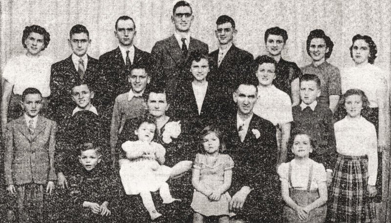 After 25 years - Mr. and Mrs. Rudolph Schoelzel, Colby, who observed their 25th Wedding Anniversary Saturday, gathered their brood for this picture of one of Wisconsin’s largest families. The Schoelzels have had 21 children in the quarter century, all single births. Nineteen of the children are living. In the front row, with their parents are (left to right) Dennis 4; Corliss 1; Colleen 3; and Sandra 7. Second row: Arlyn 8; James 10; Ronald 12; Emarita 14; Audris 13; Glenn 11; and Patsy 9. Back row: Ione 16; Darnell 17; Rudolph Jr. 24; Lyle 19; Jerry 20; Doris 21; Darlene (Mrs. Edward Wachtendonk) 22, and Beatrice 18.