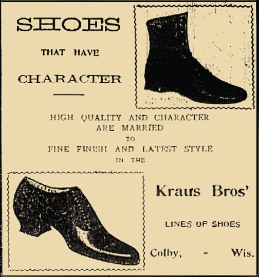 The advertisement below appeared in the Colby Phonograph June 8, 1905, featuring Kraus Brothers' Shoes of Colby, Clark County, Wisconin.