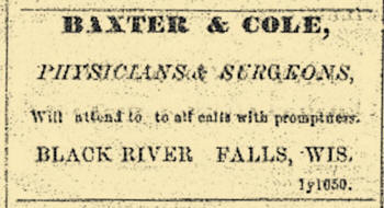 *H. B. COLE, M. D., Black River Falls. Was born in New York State, July 6, 1838. Came to Black River Falls, Wisconsin. Oct. 1, 1865, and commenced to practice his profession, and has remained there ever since. Was a graduate of the University Medical College. New York City, in the class of 1859-60, which class consisted of 150. Dr. Cole read medicine under Dr. J. L. Adams, at Cornell, New York, also under Dr. P. A. Aylett, New York City. He first practiced at Faribault, in 1860, and left there in the Fall of 1862. Was appointed surgeon of the 128th N. Y. V. I., and continued in the service until 1865, stationed at New Orleans. Then came to Black River Falls, Wis., and was married to Clara A. Baxter, July 15, 1866; she was born in New York. May 5, 1848. They have two children, Cepha H. and Halbert B. Dr. Cole has been Chairman of County Board two years, and of Village Board one year, and a member of School Board eight years. Is a member of A. F. & A. M., Black River Lodge, No. 74, Chapter, No. 41, La Crosse Commandery, No. 9, and Wisconsin Consistory. S. P. R. S., at Milwaukee.