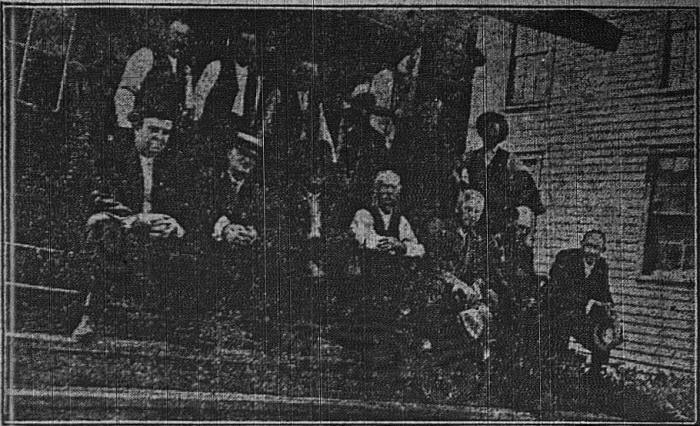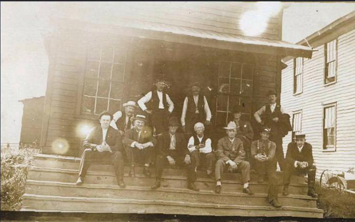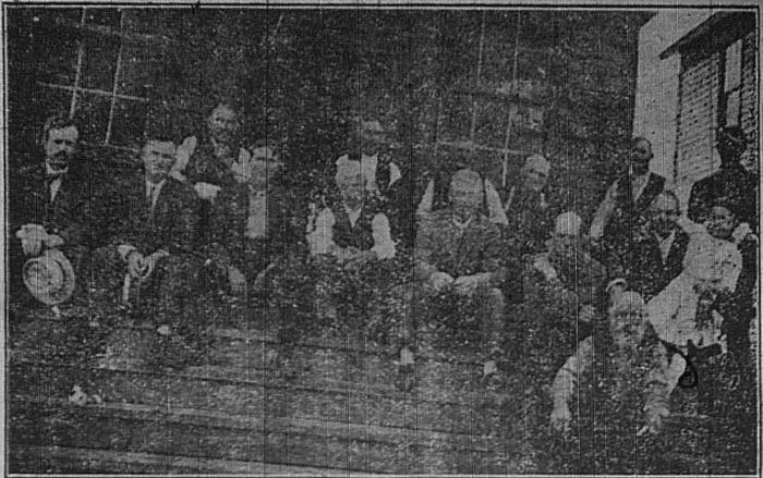 Last fall (Oct. 1911), when Dr. Arch Stewart visited here (Greenwood, Wisconsin), all of the old-time boys that could be reached at the time, got together and had a picture taken on the steps of Little Hell (above). Kin Andrews, on receiving one of the pictures, wrote the letter below. Photo contributed by the Greenwood, Wis. Library. |