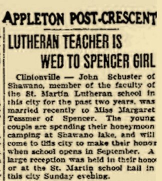 Clintonville - John Schuster of Shawano, member of the faculty of the St. Martin Lutheran School in this city for the past two years, was married recently to Miss Margaret Tessmer of Spencer. The young couple are spending their honeymoon camping at Shawano Lake, and will come to this city to make their home when school opens in September. A large reception was held in their honor at the St. Martin School Hall in this city Sunday evening. |