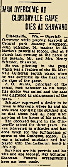 Clintonville, Wis. (Special) -- Overcome while playing baseball at Central Park Saturday afternoon, John Schuster, 24, teacher in St. Martin's Parochial School, died at 5 o'clock last evening at the house of his parents, Mr. and Mrs. Henry Schuster, Shawano. He was pitching in the game which was a feature of the St. Martin's Lutheran Parish picnic, when he was overcome by the heart near the close of the game. A. O. Kuntz, principal of the school, took Schuster to his horse. The doctor was called and the case was diagnosed as enlargement of the heart. Schuster expressed the desire to be taken to Shawano, where he and his wife were spending the summer, and he died about half an hour after arriving at the home of his parents. The deceased taught in the Clintonville school for three years. He was interested in athletics and had done much for the furtherance of sports at the Lutheran School. He was a talented musician and had played with the Lutheran Band in this city. Survivors are his parents and his wife, and one brother, Ray Schuster, Shawano. Funeral arrangements have not been made. |
