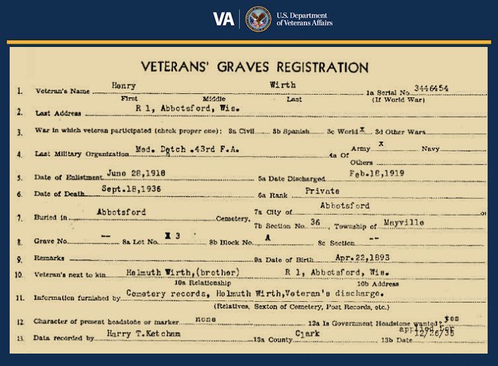 Henry Wirth, unmarried World War veteran of the town of Holton, died last Friday at the Owen hospital where an operation was performed in an effort to prolong his life. Funeral services were held Friday afternoon at the Lulloff funeral parlors in Colby and at the Presbyterian church at Abbotsford, Rev. L. C. Smith officiating. Burial was made in the Abbotsford cemetery. Pall bearers were Lester Mittelstaedt, Wayne Wyman, Claude Mayfield, Henry Ziebarth, Jack Weideman and Dell Olson. Military honors were in charge of the Abbotsford post of the Veterans of Foreign Wars with Leo Apfelbeck acting as commander and Chesley Cramer as chaplain. Color bearers and guards were Ervin Bittner, Lloyd Smith, Maurice Thompson and Harvey Bittner. Members of the Abbotsford national guard acted as a firing squad with Harry Ketcham in command.