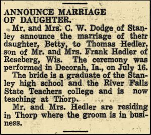 The "Courier" is pleased to record the announcement of the marriage of two popular young people of the village (Thorp, Clark Co., Wis.), Mr. Thomas Hedler, son of Mr. and Mrs. Frank Hedler of Reseburg, and Miss Betty Dodge, daughter of Mr. and Mrs. C.W. Dodge of Stanley. The event took place at Decorah, Iowa, on Saturday, July 16th, 1938. The bride has been a teacher in the public schools here for several years and the groom is proprietor of the Auto Café.