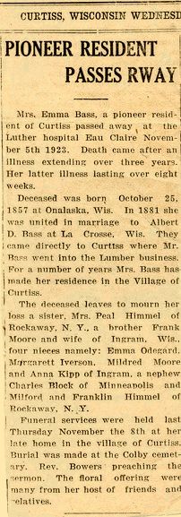 Mrs. Emma Bass, a pioneer resident of Curtiss passed away at the Luther Hospital, Eau Claire, November 5, 1923. Death came after an illness extending over three years. Her later illness lasting over eight weeks.