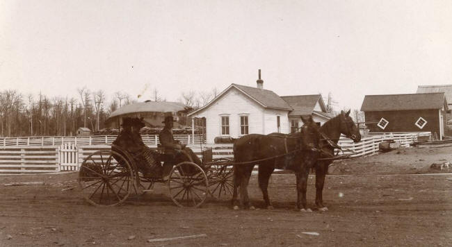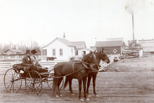 Albert & Emma riding in their carriage with their home and lumber mill in the background.
