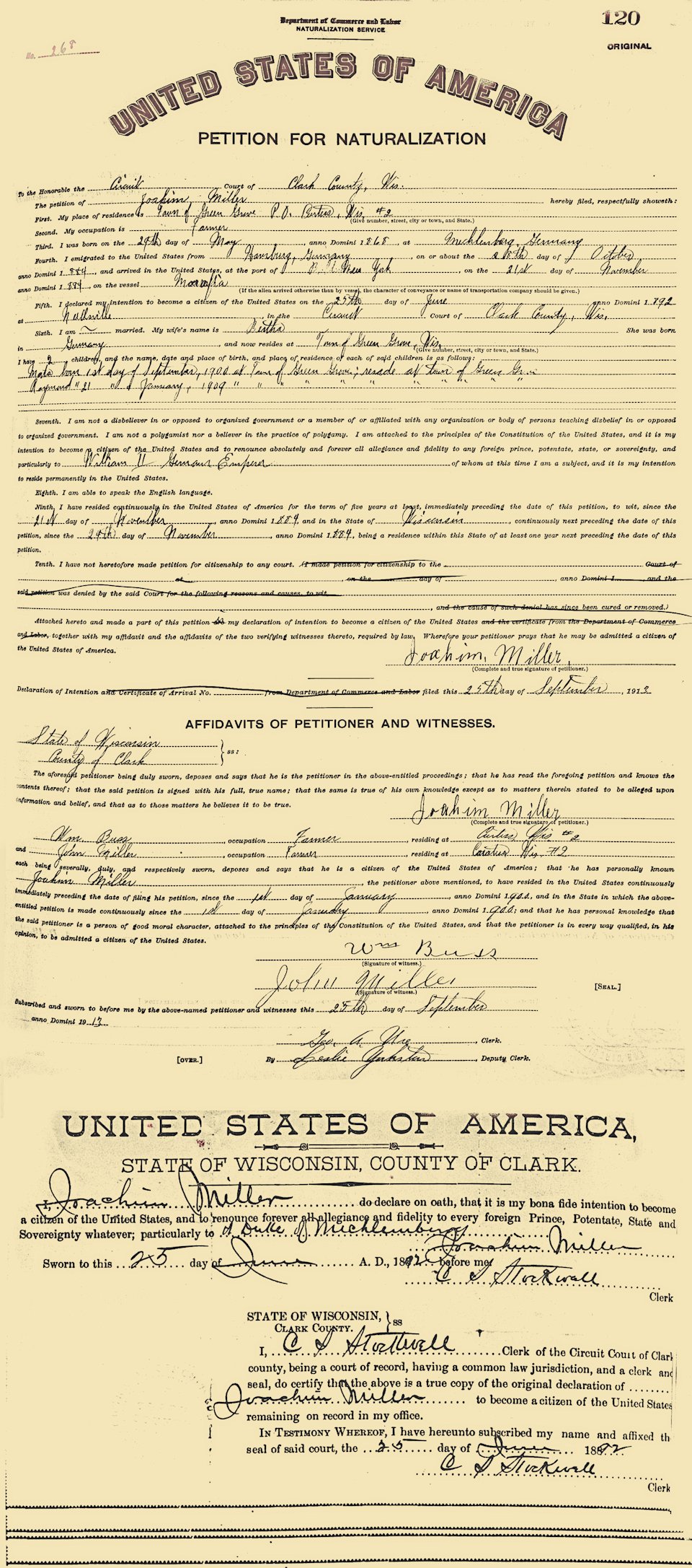 Naturalization: Joachim Miller Male 29 May 1868 Meklenberg, Germany Bertha Naturalization 25 Sep 1913 Clark, Wisconsin, United States 268