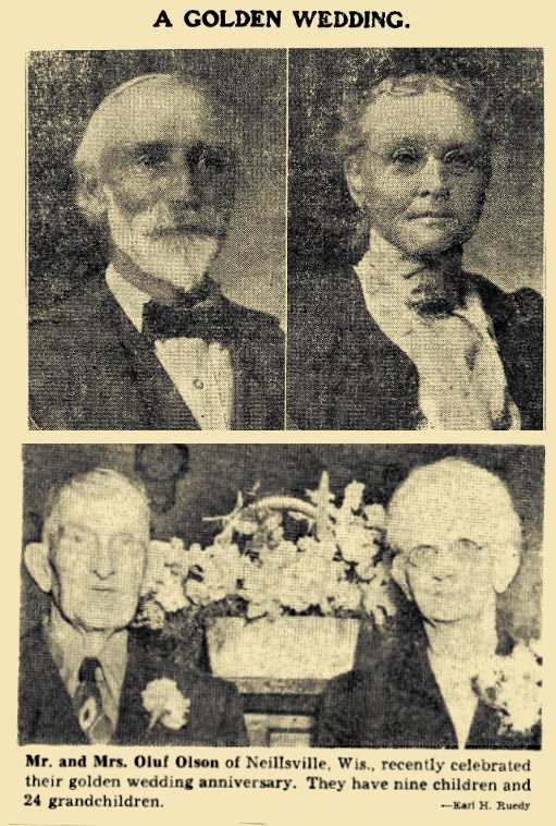 Mr. and Mrs. Olson were married March 27, 1901, and spent the first 14 years of their married life on various farms in northern Clark County and Marathon County and Abbotsford, Wis. In December 1914, they moved to Neillsville where they have since resided.